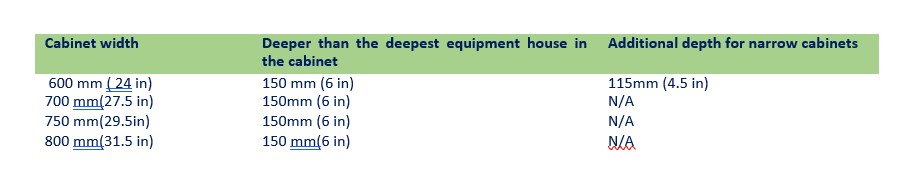 To ensure adequate airflow and to provide adequate space for power strips, telecommunications cabling, and safe access for work, the cabinet depth should be at least 150 mm (6 in) deeper than the deepest equipment to be housed if the cabinet is 700 mm (27.5 in) wide or larger.