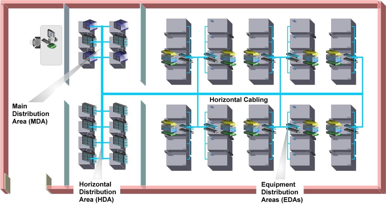 The MDA may serve one or more IDAs, HDAs, and EDAs within the data center and one or more telecommunications rooms (TRs) located outside the computer room space to support office spaces, operations center, and other external support rooms.