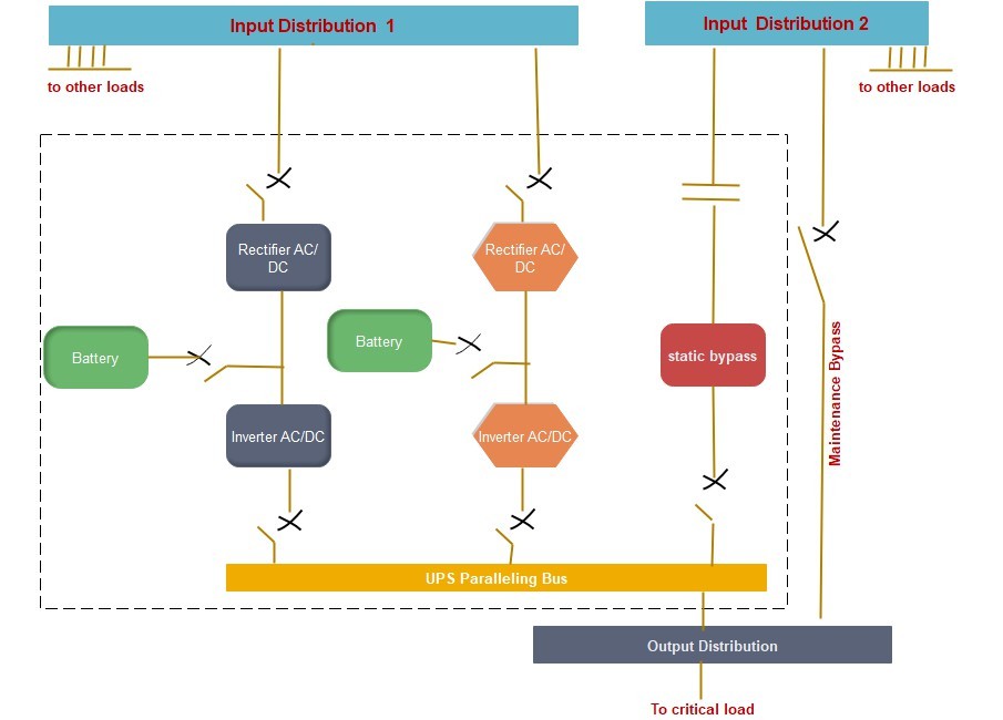 When the input to the rectifier and the static bypass originate from one bus (Input Distribution 1) and the maintenance bypass originates from a separate bus (Input Distribution 2), the critical load shall be transferred without interruption or disturbance to an isolated source, either utility or generator, depending on the design, while the UPS is repaired or tested.