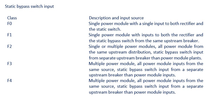 - Combining maintenance bypass and static bypass paths from a single input feeder will typically result in a lower Class because it reduces the ability to remove a module or system without interrupting the service to the downstream critical loads.