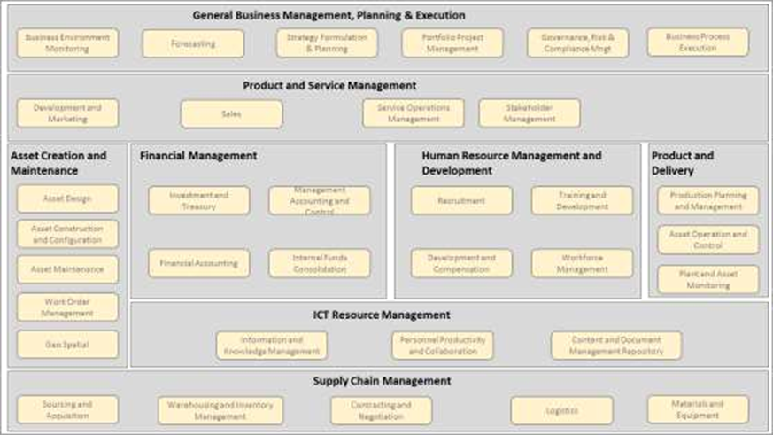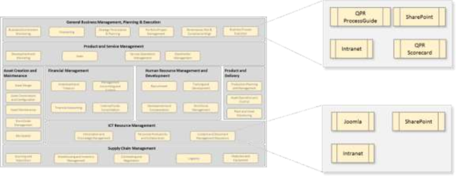 The top-level view of the model merely depicts the capabilities of respective applications per business / functional areas. Concealed within the top level view are the actual names of applications. While this diagram is important and conveys important information, the real value comes from the ability to conduct impact assessment for each application. This view provides a strong foundation for determining the extent at which an application is used within the environment.